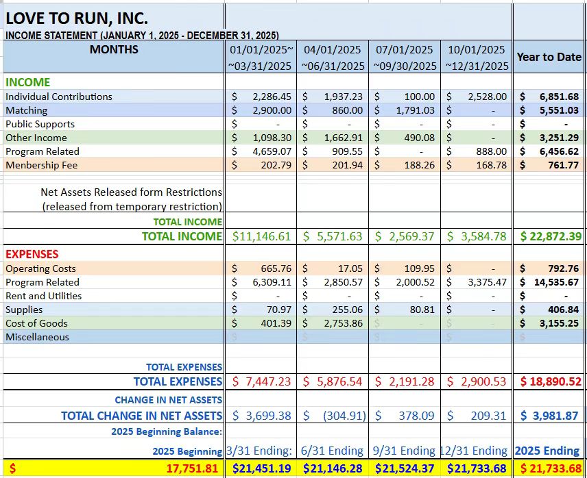 这是爱跑截至今年 11 月的账务报表, 衷心感谢大家在过去一年中对爱跑的持续捐赠与支持