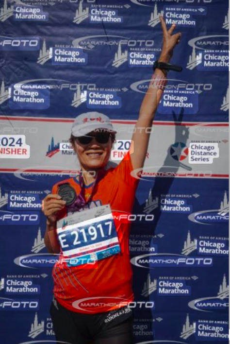 22迈过了中国城,没有非常疲惫,心率145左右,看看周围的跑者,大都迈着沉重的步伐。这时突然一个蓝衣蓝裤编着麻花辫儿的妹子从背后冲出来,大步流星地从我身边跑过,我毫不犹豫,身不由己地追了上去,渐渐的我进入了runner’s high, 周围的一切,热情的观众渐渐褪去,时空静止,只有蓝衣妹子和我,蓝衣妹子的麻花辫在我面前快速飞奔,我亦步亦趋,对自己说”跟着她,不能掉速,就是不能掉速!”,居然寸步不离的跟到终点!掐表一看, PR3 分钟!那一刻一股不可抗拒的幸福感涌上心头,只有喜悦,无尽的高兴,那种嘴巴快裂到耳根子的高兴劲儿!四周寻觅蓝衣妹子说声谢谢,却丝毫不见她的踪影。